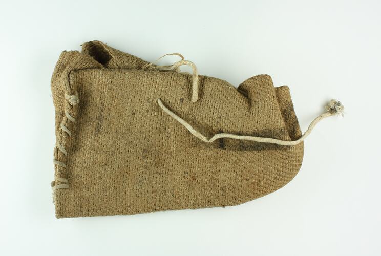 Hessian shearer's mocassin. Constructed by folding a rectangular piece of hessian in half and sewing one edge straight and gathering the opposite edge to form a toe. White cord has been used to hold the moccasin together and as a lace.