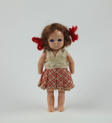 Plastic girl doll with sleep eyes, which move closed when the doll is lying flat. Doll has brown hair, decorated with red wool ties. She is wearing a white and red fabric dress. Clothing slightly discoloured.