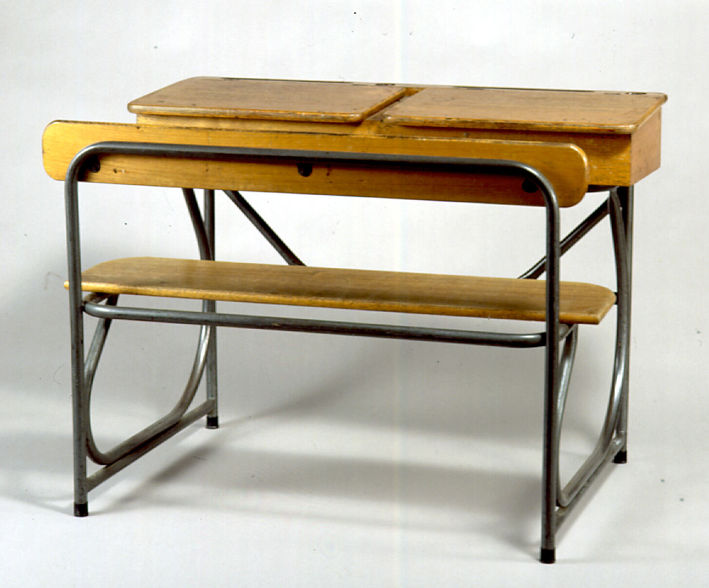 Wooden two-seat school desk, used in a classroom at MacRobertson Girls' High School, circa 1950s. Last used around 1975. The desk was originally lent for display at the Museum in the Story of Victoria exhibition in 1985, and was subsequently donated to Museum Victoria.