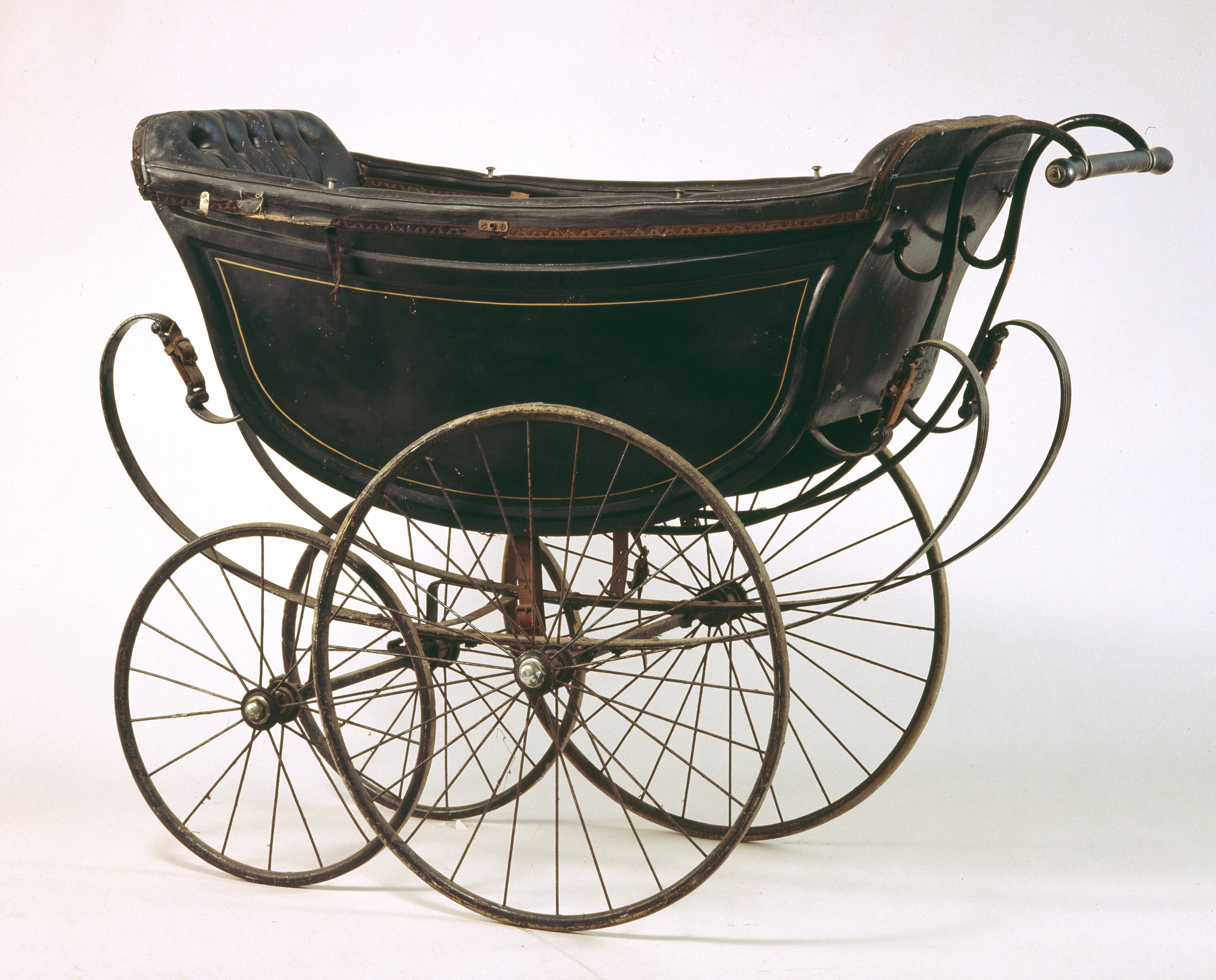 Wooden framed, steel sprung perambulator upholstered in black leather for two infants. Two seats face each other, each with buttoned leather back. Base is formed by 3 removable buttoned cushions. Beneath a small removable panel reveals wooden storage compartment. The smooth internal leather sides of the pram feature an edging of braid 1.5cm wide. Buckled leather straps are attached onto the braid on either side of pram, intended to hold occupants into place. The wooden exterior of pram is painted glossy black and finished with a fine (2mm) decorative line of gold. Pram is attached onto its sprung base by six buckled leather straps. Rubber trimmed wheels. The handle, trimmed with brass, is of rounded, black painted wood. The pram was originally hooded.