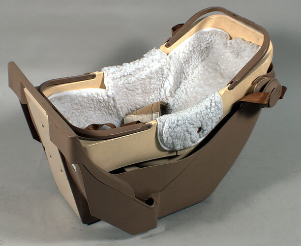 .1 - Ct 2000 'Safe-N-Sound' baby safety capsule made of toughened brown plastic. A seat belt extends from the rear of the capsule to secure the capsule in place. .2- Cream-coloured plastic bassinet, lined with woollen underblanket, fits inside the capsule. A belt, fastened by velcro tabs, keeps the baby secure within the bassinet.