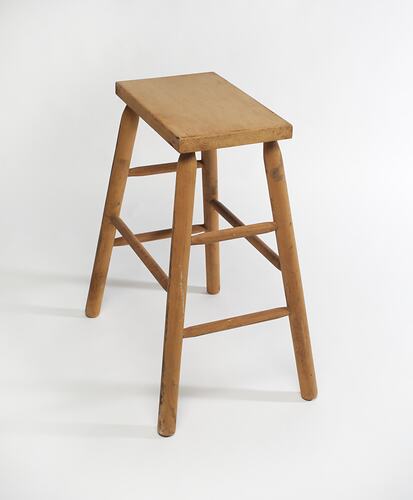 Plain table made from a light gold-coloured wood with small rectangular top with four sturdy legs that lean outwards from the top. There is one rung attached to the legs along the sides of the table and two rungs attached to the legs along the ends of the table. The rungs are situated about halfway down the legs.