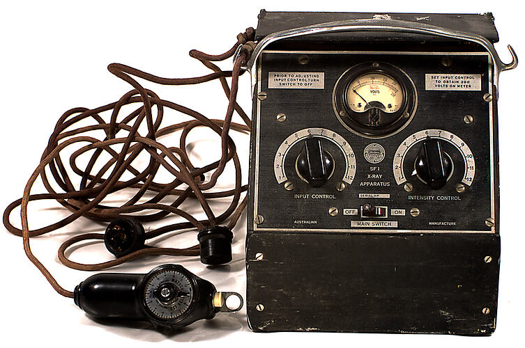 X-ray apparatus is in a metal square sloping side box. Technique chart, attached to a lift-up lid. Handle has two hooks each side for electric cords. Front of sloping panel has a meter scale 50-250. Beneath are the Input control, and Intensity control dials, scale 1-12 painted on them. In the centre of the dials is a trademark. Below is a main switch, three electric cords attached to the inside of the box; one cord has a press button timer attached. A round chrome tin-shaped, adjustable film ? cannister appears to be used for exposure of light, not complete. Dental X-ray machine has tall, upright, chrome-plated, steel pole, supporting horizontal shaft on end of which is black plated, barrel-shaped X-ray machine (40xm long) which has small cone-shaped protrusion (on screwed-on plate), on one side. Machine has 3 - pronged electrical plug set in one end, and band of silver metal stripes round centre. Machine suspended on U-shaped bracket, attached at each end of barrel, allowing it to spin. Has short pipe with stirrup-shaped handle on side, fits end of horizontal shaft and can be rotated. Horizontals joined to pole by black-plated, triangular bracket which has wind- ing handle that lowers or raises whole horizontal up and down grooved track screwed all the way down side of pipe.