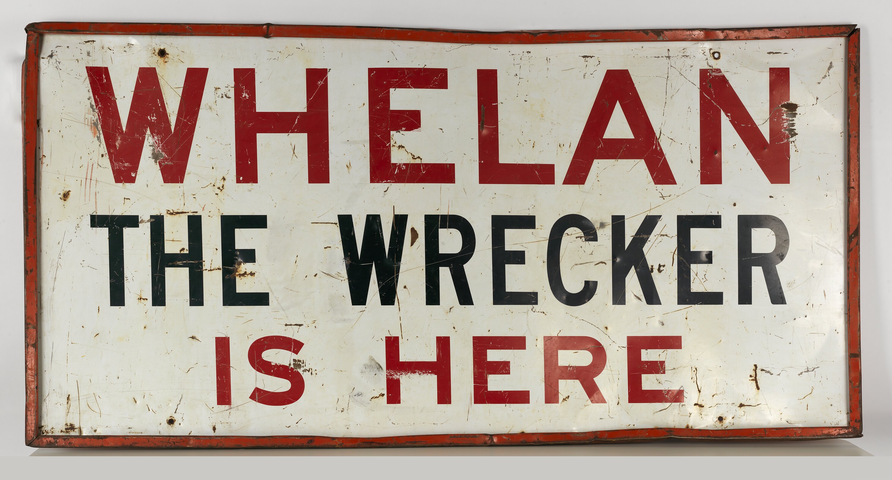 This painted metal sign bears the famous slogan of Whelan the Wrecker - "Whelan the Wrecker is here." See SH 920815 for the possible origins of this slogan. It was donated to the Museum by Myles Welan after his demolition and scrap metal merchant company went into receivership in 1991.