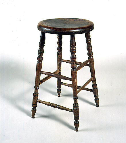 Wooden stool with four legs, turned, and five stretchers, also turned, with two crude replacement stretchers.