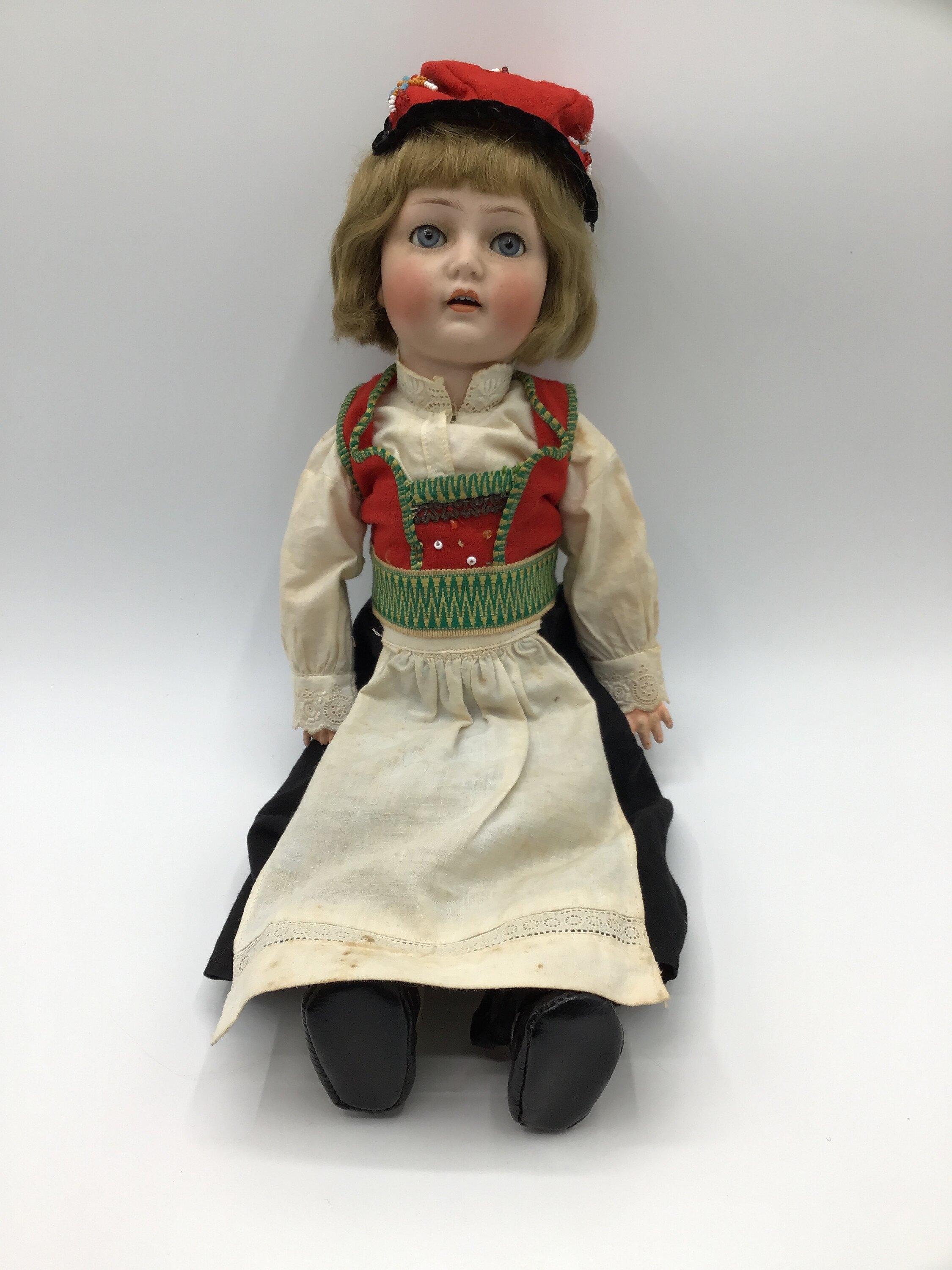 Doll in its original box with original straw and paper packaging. It was purchased for Rosemary Norman for her sixth birthday by her mother during a trip to London in 1939. The doll is dressed in what is a representation of a German regional costume. The doll also has two extra pairs of knickers and a pinafore made by Rosemary's nanny, probably during the 1940s.