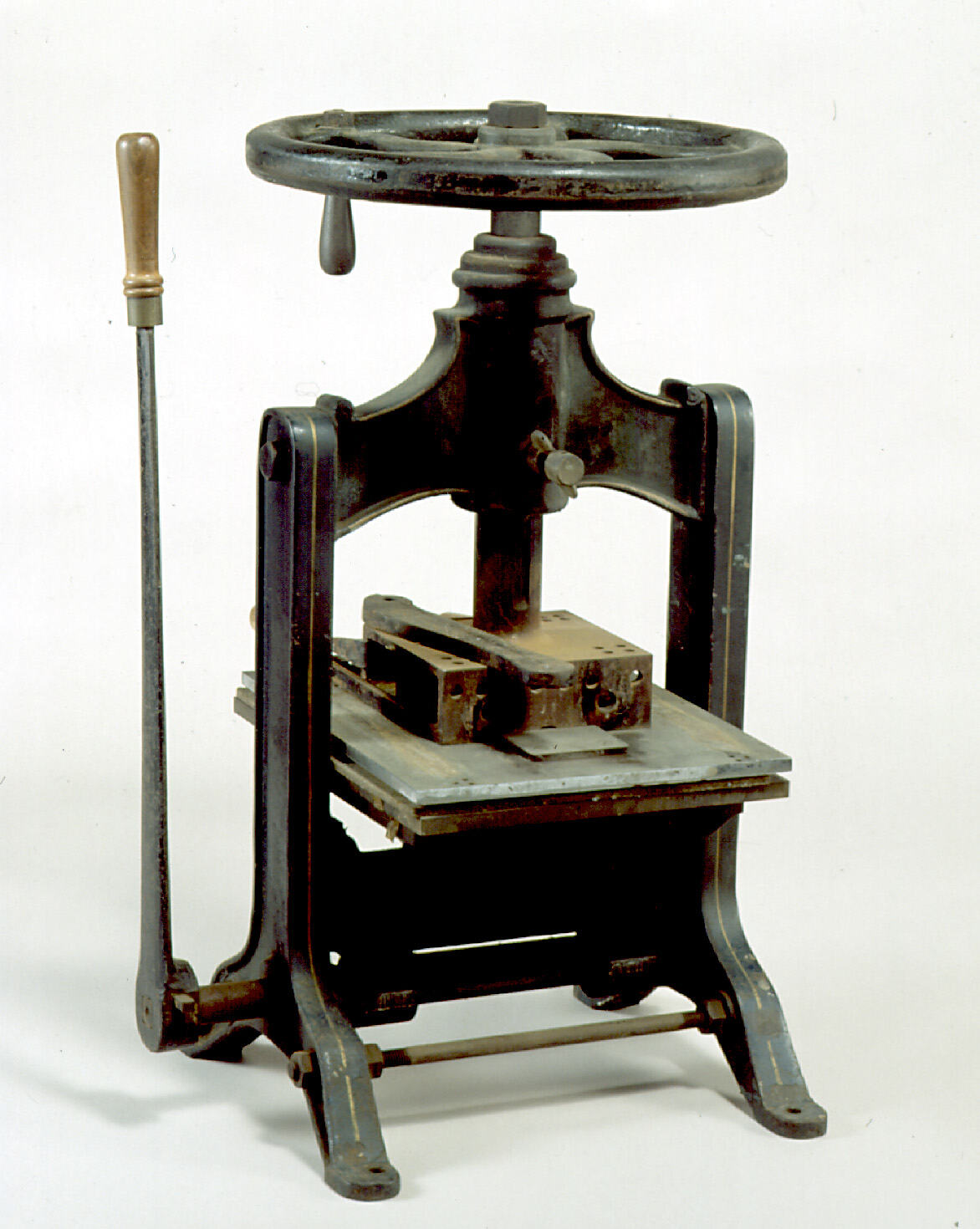 Leather embossing machine and steel patterns used to create patterns or designs on leather at Simpson's Gloves Factory, Richmond, Victoria, Pty Ltd, Richmond.