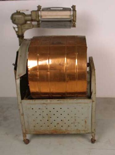 Electric washing machine, rocker action. Washing compartment is a copper barrel, mounted on a grey painted metal frame on castors. Frame has perforated metal panels front and back. Copper barrel has opening hatch with handle at top. At top, frame supports wringer with rubber rollers. Electric cord and switches are on left side.