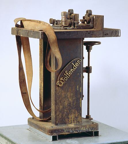 Spindle Moulder manufactured by Wolfenden Bros, circa 1930-1970. It was taken from Adolph Bruhn & Son's Wood Turners Shop, 283 Coventry Street, South Melbourne. The business was established by Adolph Bruhn circa 1893 in Little Collins Street, Melbourne. Upon his death in 1919 it was then operated by Adolph's son Sophus Christopher Bruhn. Upon Sophus's death in 1959 his son Sophus Walter Bruhn took over the business. In 1970 Sophus reduced the scale of the business and relocated to South Melbourne. The business closed upon Sophus's death in January 1990.
