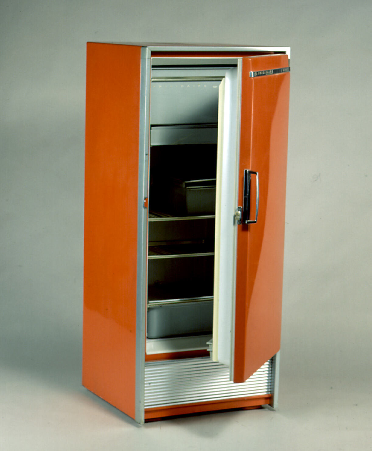 Electric, square-shouldered, enamelled sheet metal refrigerator. Red with silver trim. FRONT: a corrugated, silver metal foot plate below the door. DOOR: a silver metal band across the top. Hinged at right. HANDLE - bar at left. BACK: exposed compression unit below 1/2 height grill. White electrical cord with 3 pronged plug. INTERIOR: soft pink enamel. Upper left light bulb behind frosted glass box. Light release button middle right. 4 pegs for under freezer tray. Hooks for 4 further shelves. 1 runner for a sliding shelf. Temperature dial upper right, white plastic dial with blue plastic centre in a silver metal frame. FREEZER COMPARTMENT - full width. Grey door with full length metal bar handle at top. Interior one large compartment with separate shelving at left for 3 ice trays. DOOR - white plastic lining with grey rubber seal. 2 columns of fittings. At left, four shelves, at right 7 compartments with grey, plastic doors, hinged at bottom (top one missing).