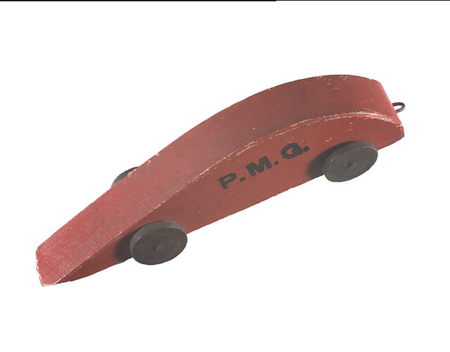Wooden toy van, painted red with 'P.M.G.' painted in black letters on each side. Flat bottom; curved top which ends in a point at one side. Van made out of one piece of timber. Has four wheels made of masonite. Each pair of wheels, front and back, are joined by a metal rod. A metal hook at the back may have been intended to pull the van along.