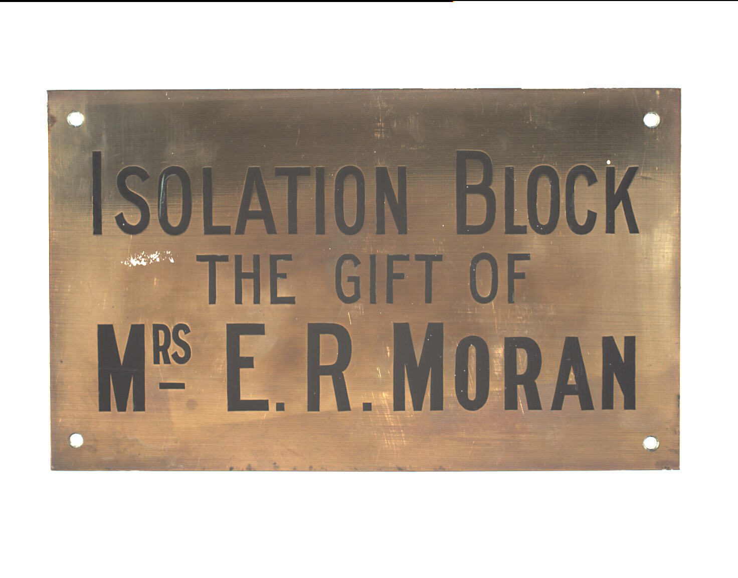 Debossed text reads "ISOLATION BLOCK / THE GIFT OF / MRS E.R. MORAN".
