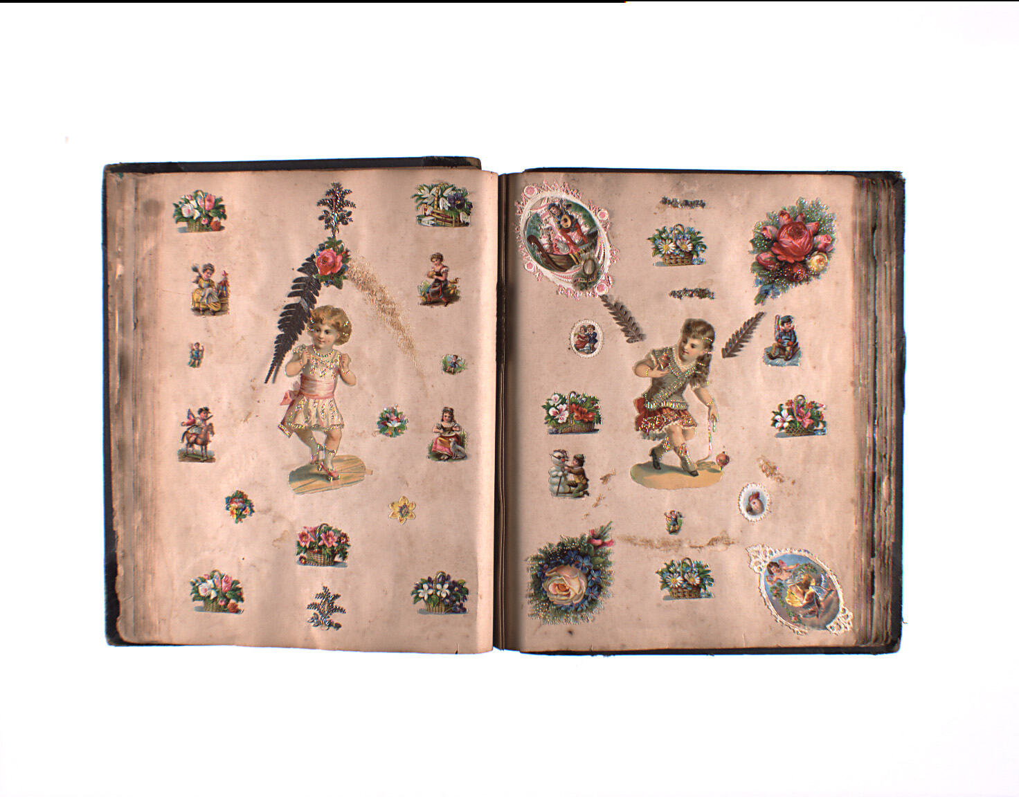 Scrapbook probably made circa 1880-1910. The pictures in the book are highly romanticized or stereotypical images, of the sort bought for a few pennies apiece in late Victorian times. The scrapbook has no hand-writing and its provenance is unknown. It was acquired with another scrapbook, also of unknown provenance - SH880820.