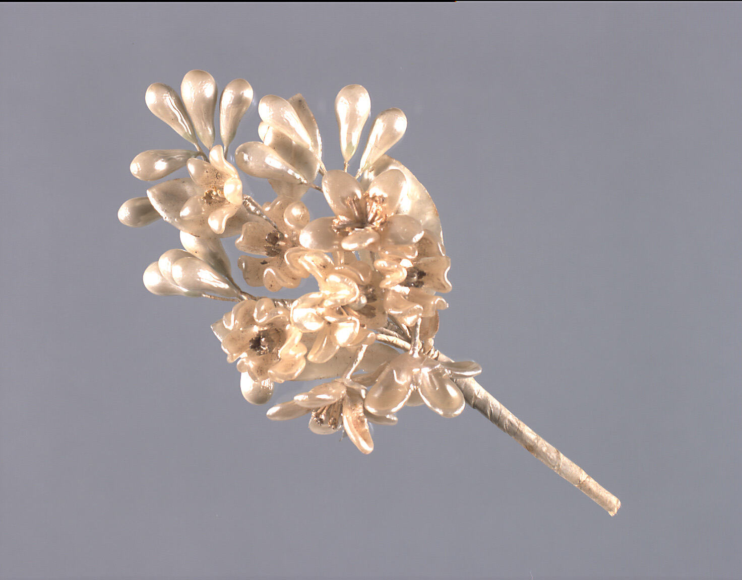 Small bunch of artificial flowers comprised of four leaves, eight flowers and three bud clusters. The flowers, buds and leaves are plastic. The leaves and flowers are finished with a deep cream coloured varnish and the buds are finished with a pearly green varnish. The bunches have been formed by wine stems, attached to the backs of flowers, leaves and buds, being bound tightly together with thread and tape to form a thick stem crowned by the flower arrangement. It should be noted that the bud clusters were made via the afore-mentioned process.