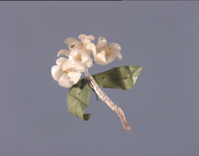 Thirty-one components used in artificial flowermaking by Miss E. M. Barnett. Components 1 to 16 are pearl petal-shapes on thin stiffened cotton stems. Components 17 to 23 are various green stiffened or coated leaves. Component 24 is a small stem of pearl beads tied together with cotton. Components 25 to 27 is a set of three wax flowers, wired together. Component 28 is a cloth cream flower. Components 29 to 30 are parts of two wax flowers. Component 31 is an unfinished wax flower spray consisting of three flowers on a clumsy stem.