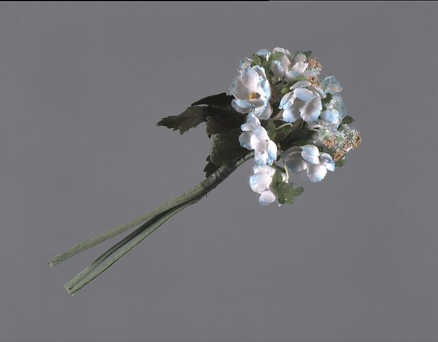 Small spray of artificial blue flowers. Made or acquired for use by Miss Edith M. Barnett.