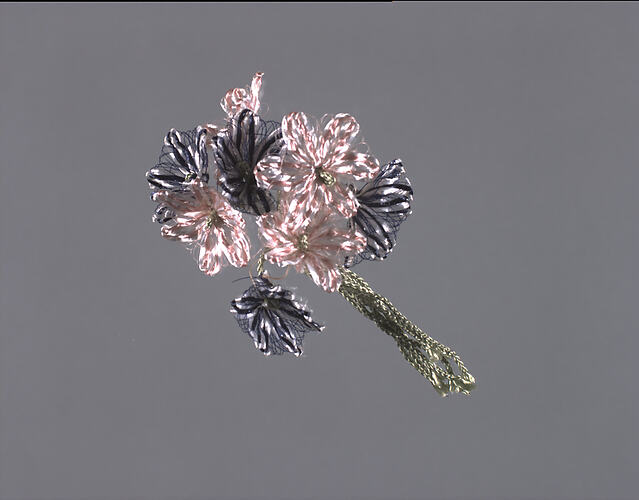 Small spray of pink and blue milliner's flowers. Made or acquired for use by Miss Edith M. Barnett.
