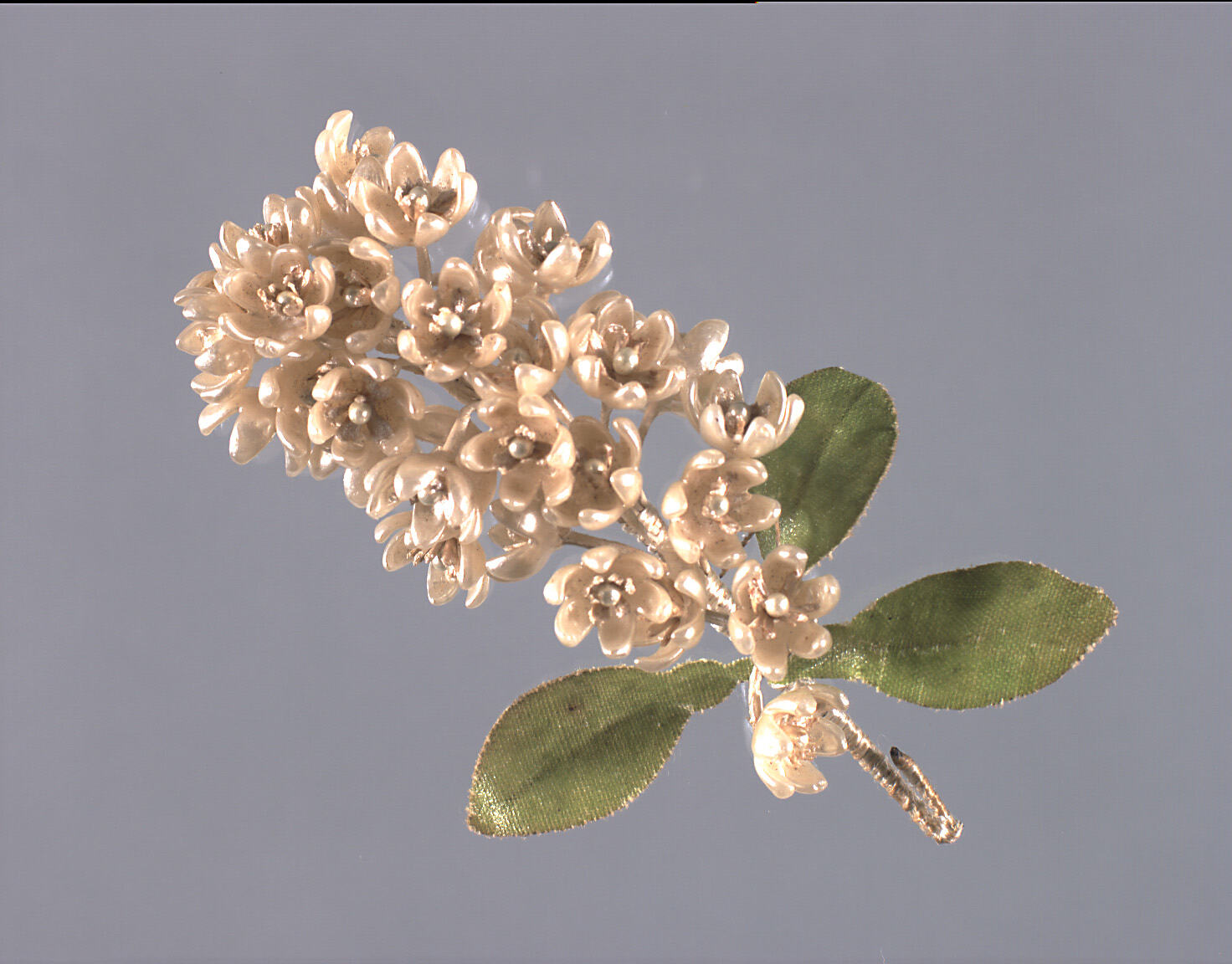 A small bunch of artificial flowers comprised of 53 flowers and 3 leaves. The plastic flowers are finished with a pearly varnish. The leaves are made from green cotton finished with varnish. The bunch has been formed by wire stems attached to the backs of the flowers and leaves being tightly bound together with thread to form a thick stem which runs through the centre of the flower arrangement.