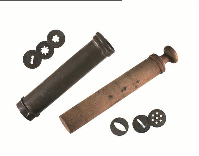 Long metal tube with a detachable end. Solid wood stamper (with turned handle at one end) fits inside the tube. Six circular metal discs with different shapes cut out of their centres, which are dropped into the tube, and the mixture pushed through with the wood stamper.