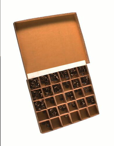 Box of initialed buttons. Used at Simpson's Gloves, Richmond, circa 1930s, in the production of handbags, wallets, etc..
