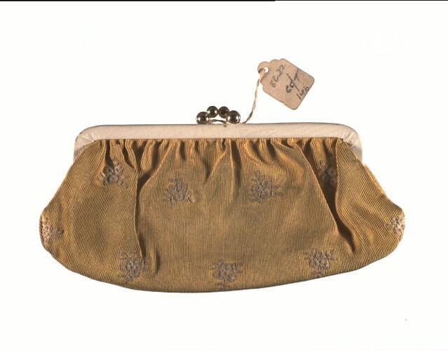 Gold Gosgrain purse manufactured by Simpson's Gloves Pty Ltd, circa 1960s. It was found in the storeroom behind the salesman's office.