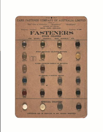 Sample card of fasteners made by Carr Fastener Company, circa 1950. Used at Simpson's Gloves Pty Ltd, Richmond