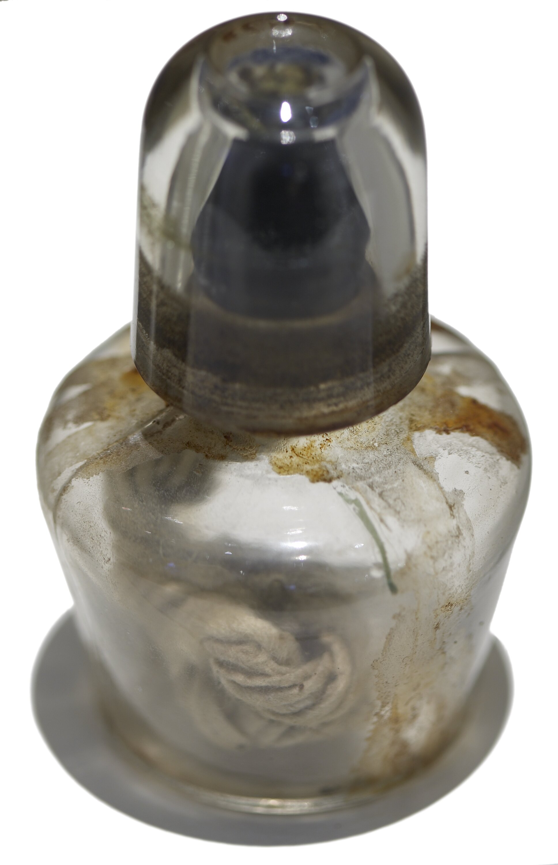 Small glass lamp with coiled twine wick in base; glass top inverted over wick. It is no longer possible to remove the top, which has been jammed down onto the base. The base was probably filled with kerosene.