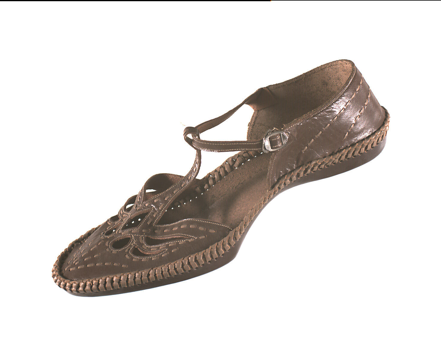 Unfinished left shoe sample in brown leather made in Stafford, England, 1933. It was used at Simpson's Glove Pty Ltd and was found in a box in the shed above the air raid shelter. Amos Simpson had fiends in the boot trade, he attempted to assemble shoes but did not go into full manufacture.