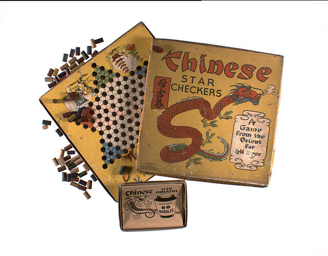 Chinese Star Checkers game comprising: Playing surface - cardboard base which fits inside box bottom, consisting of a series of large holes in the shape of a hexagonal star. Around the edge are illustrations of chinese subjects. 60 small wooden cylinders, 10 each: blue, green, pink, brown, yellow and white. These are the playing pieces, one colour for each player. The cylinders are placed in the holes on the playing surface. Small cardboard box for playing pieces. The bottom of the box (.4) has a piece of paper attached which reads "Chinese STAR/CHECKERS/CONTENTS/60 MARBLES". Box lid of game, features a picture of a dragon and reads "Chinese/STAR/CHECKERS/A/Game /from the/Orient/for/All Ages" Underside of lid has rules for playing Chinese Checkers and details of manufacturer box bottom.