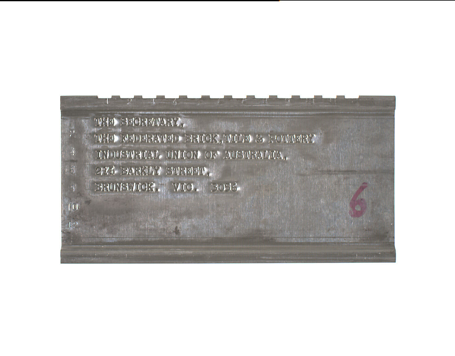 Stamped in upper and central portions: THE SECRETARY,/THE FEDERATED BRICK, TILE & POTTERY/INDUSTRIAL UNION OF AUSTRALIA,/216 BARKLY STREET,/BRUNSWICK, VIC. 3056. Marked lower right in pink ink or dye "6".