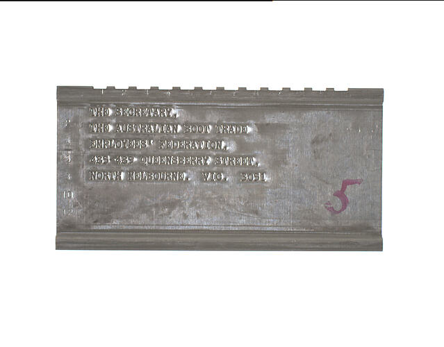 Metal Address Plate for the Australian Boot Trade Employees' Federation, circa 1980-1985. It is one of a set of 34 Address Plates used on a label printing machine which was employed for circularisation of mail to unions affiliated with the Victorian Trades Hall Council.
