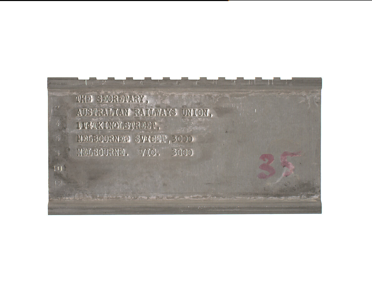 Stamped: THE SECRETARY,/AUSTRALIAN RAILWAYS UNION,/ 114 KING STREET,/MELBOURNE. VIC. 3000/MELBOURNE. VIC. 3000 [this last line cancelled]. Marked lower right in pink ink or dye "35". pink ink or dye "34".
