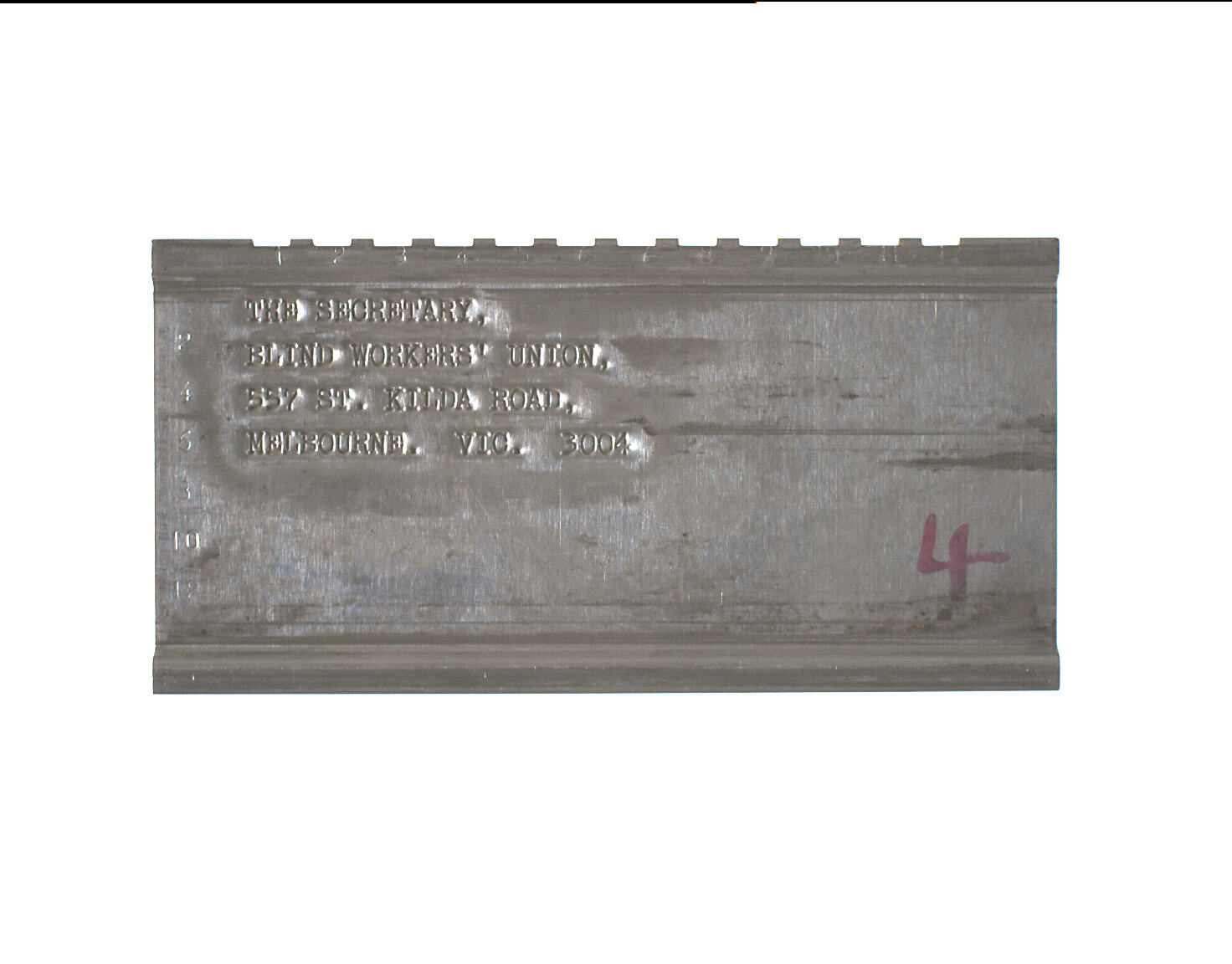 Stamped on upper half: THE SECRETARY,/BLIND WORKERS' UNION,/557 ST.KILDA ROAD,/MELBOURNE. VIC. 3004. Marked lower right in pink ink or dye "4".