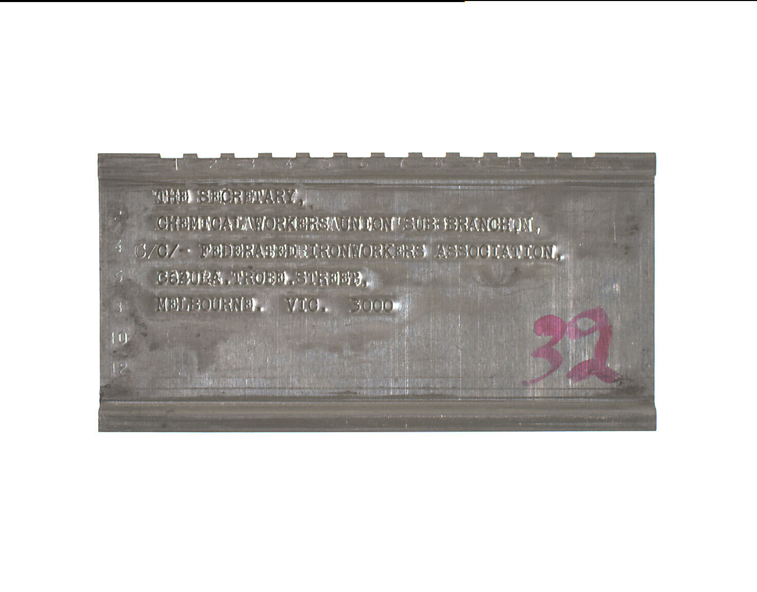 Stamped: THE SECRETARY,/CHEMICAL WORKERS UNION SUB-BRANCH,/C/- FEDERATED IRONWORKERS ASSOCIATION,/364 LA. TROBE STREET,/MELBOURNE. VIC. 3000. Marked lower right in pink dye or ink "32".