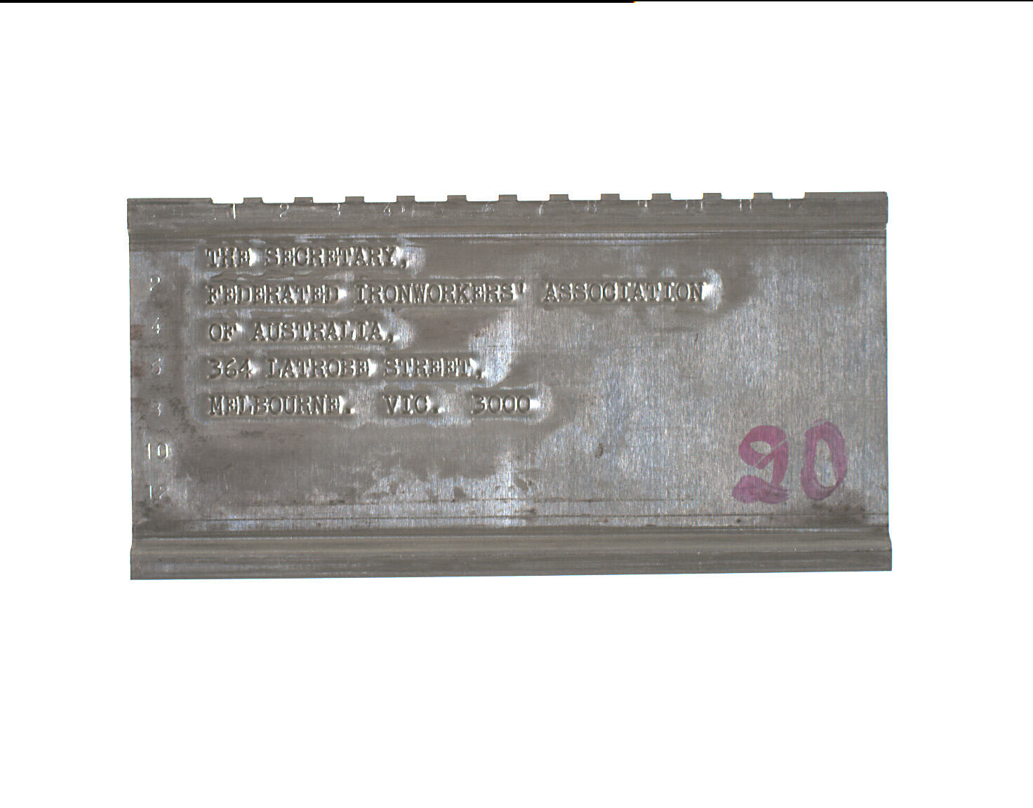 Stamped: THE SECRETARY,/FEDERATED IRONWORKERS' ASSOCIATION/OF AUSTRALIA,/364 LATROBE STREET,/MELBOURNE. VIC. 3000. Marked lower right in pink ink or dye "20".