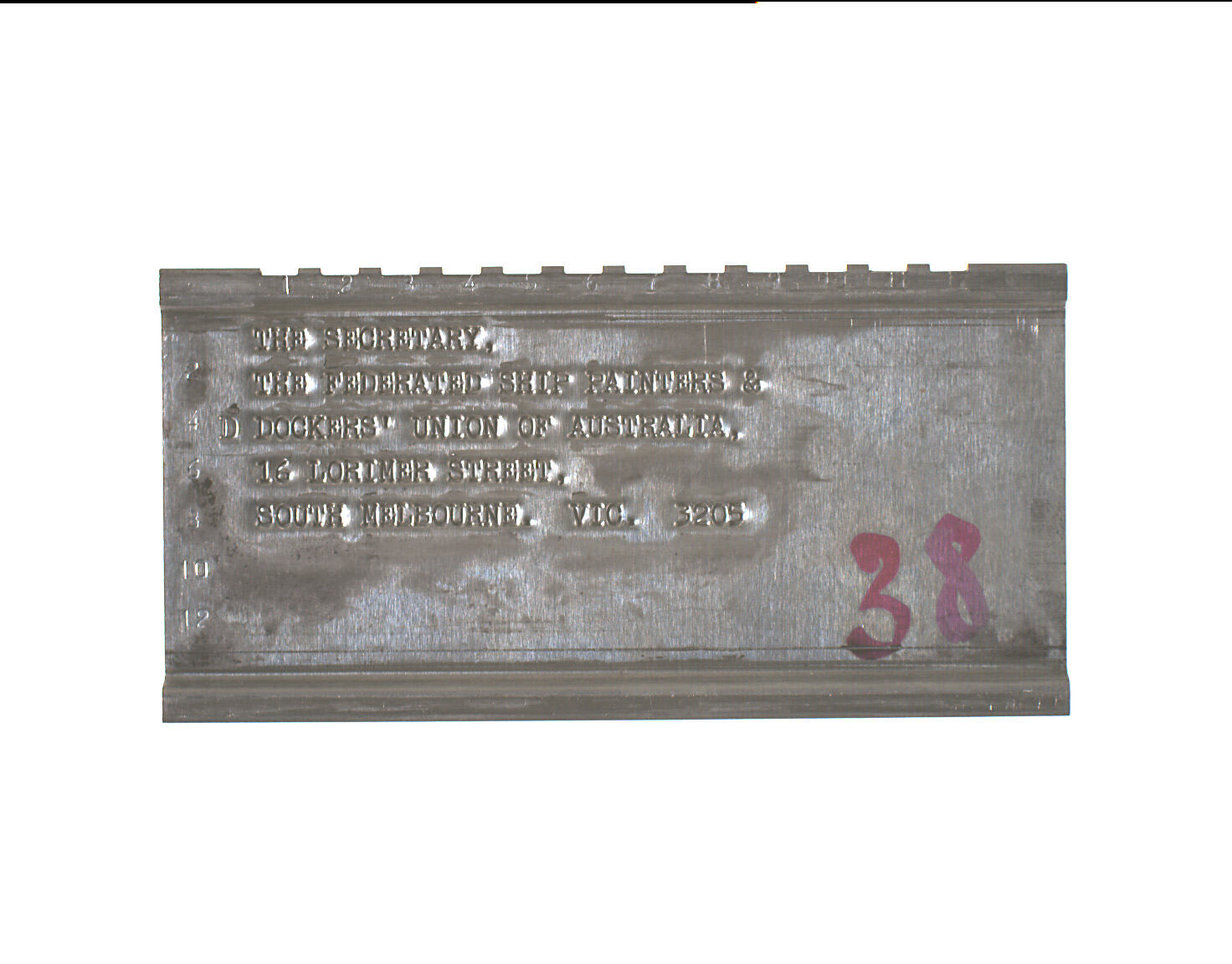 Stamped: THE SECRETARY,/THE FEDERATED SHIP PAINTERS &/D [last character cancelled] DOCKERS' UNION OF AUSTRALIA,/16 LORIMER STREET,/ SOUTH MELBOURNE. VIC. 3205. Marked lower right in pink ink or dye "38".