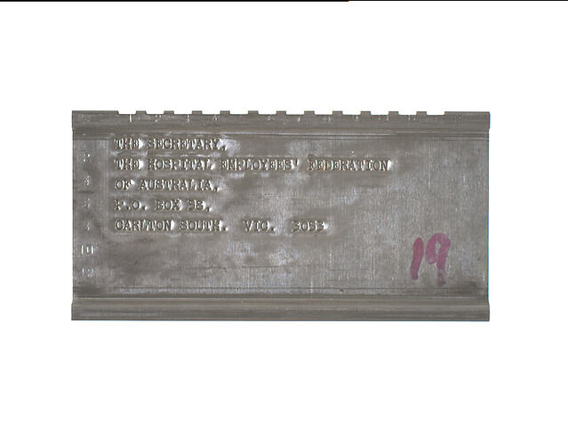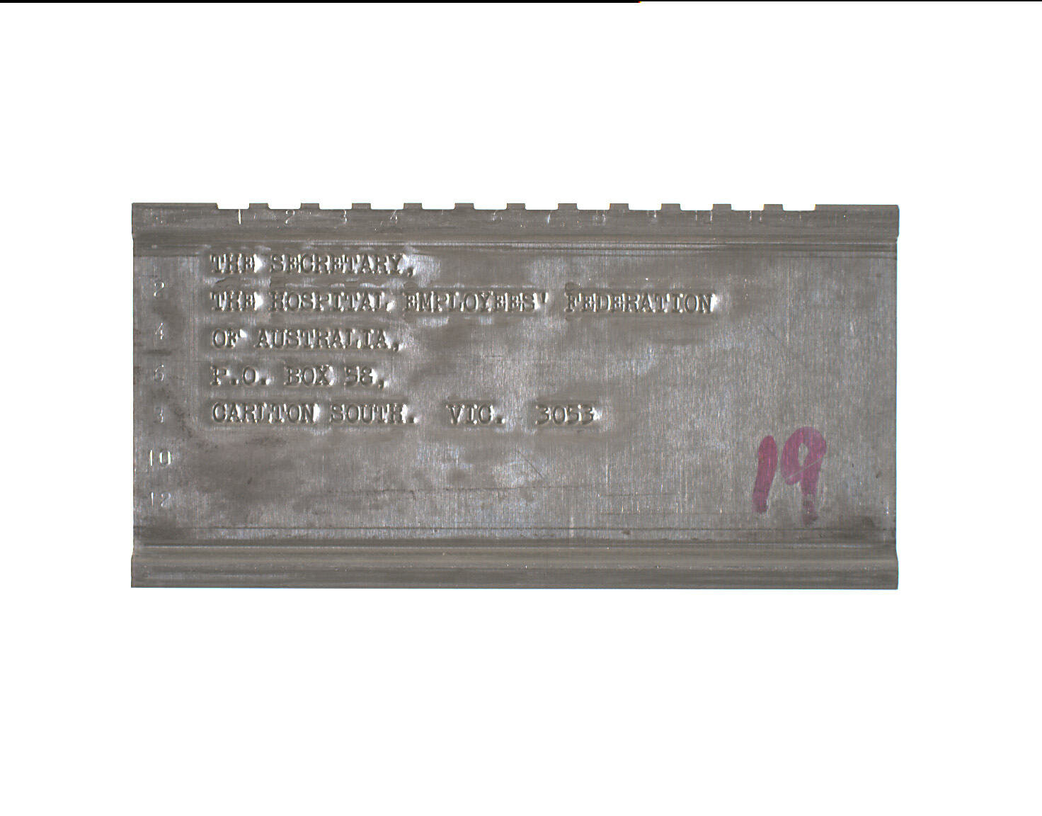 Metal Address Plate for the Hospital Employees' Federation of Australia, circa 1980-1985. It is one of a set of 34 Address Plates used on a label printing machine which was employed for circularisation of mail to unions affiliated with the Victorian Trades Hall Council.