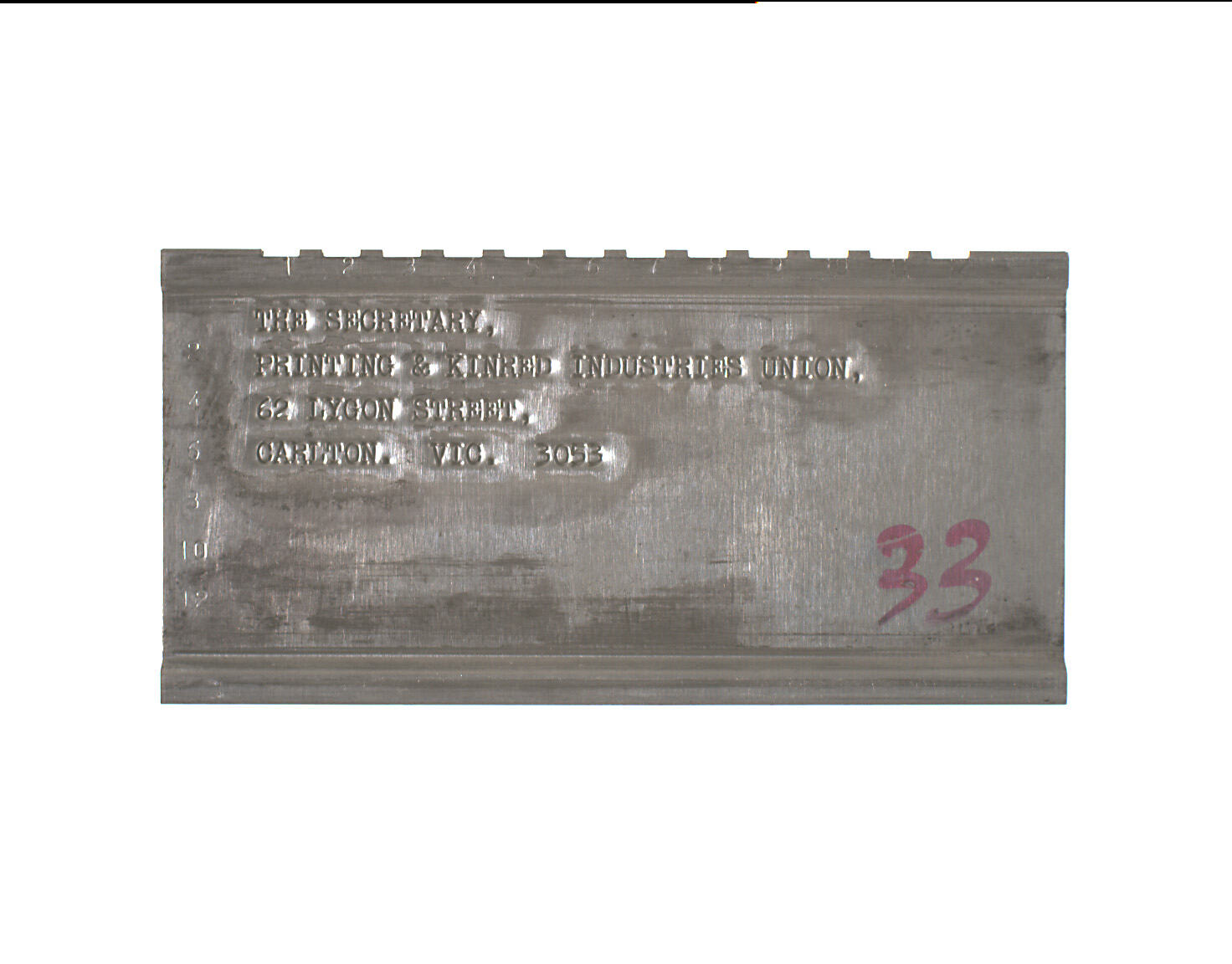 Stamped: THE SECRETARY,/PRINTING AND KINRED [sic] INDUSTRIES UNION,/62 LYGON STREET,/CARLTON. VIC. 3053. Marked lower right in pink dye or ink "33".