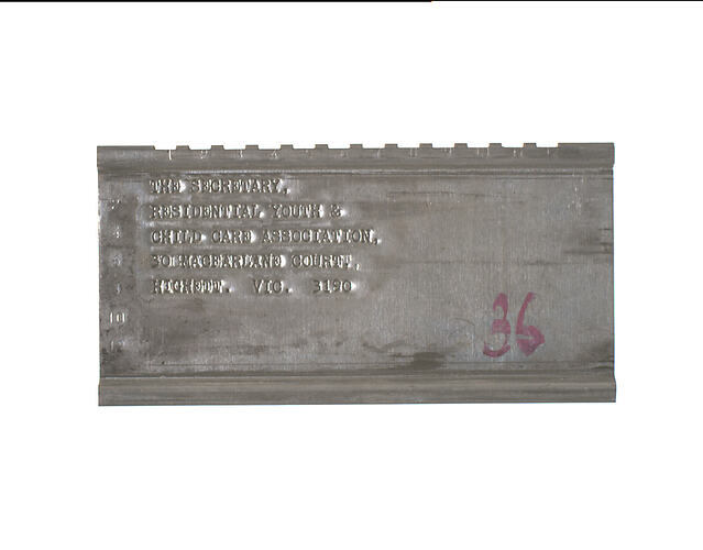 Metal Address Plate for the Residential Youth & Child Care Association, circa 1980-1985. It is one of a set of 34 Address Plates used on a label printing machine which was employed for circularisation of mail to unions affiliated with the Victorian Trades Hall Council.