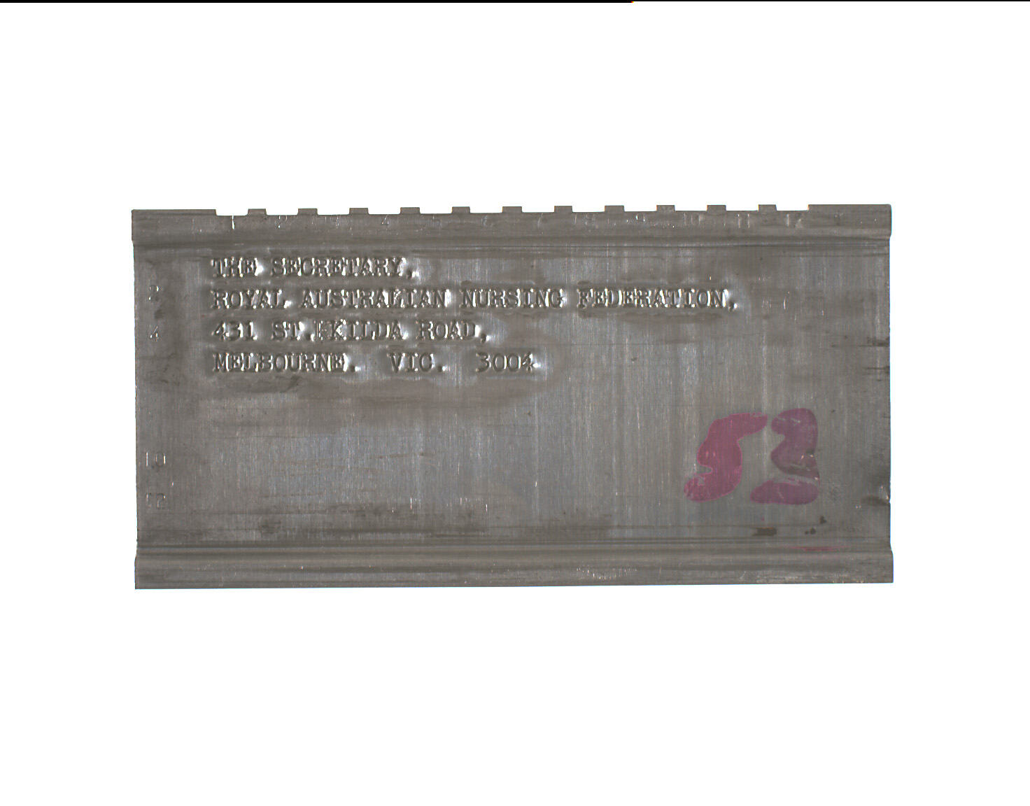 Metal Address Plate for the Royal Australian Nursing Federation, circa 1980-1985. It is one of a set of 34 Address Plates used on a label printing machine which was employed for circularisation of mail to unions affiliated with the Victorian Trades Hall Council.