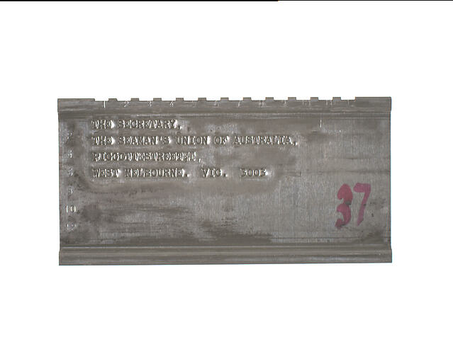 Stamped: THE SECRETARY,/THE SEAMAN'S UNION OF AUSTRALIA,/ PIGGOTT STREET,/WEST MELBOURNE. VIC. 3003. Marked lower right with pink ink or dye "37".