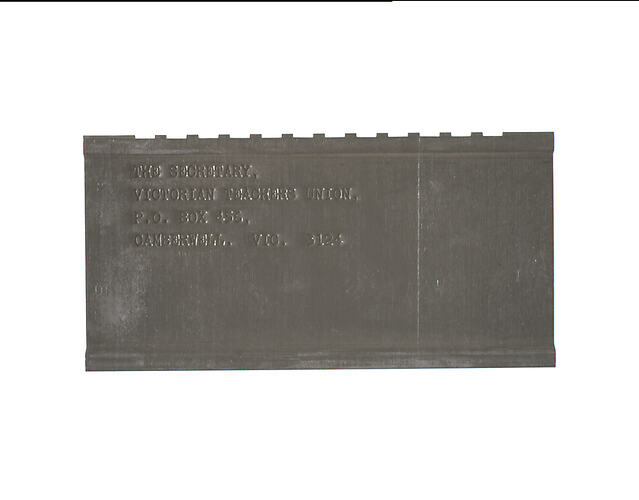 Metal Address Plate for the Victorian Teachers' Union, circa 1980-1985. It is one of a set of 34 Address Plates used on a label printing machine which was employed for circularisation of mail to unions affiliated with the Victorian Trades Hall Council.