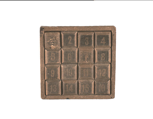 Set of numbered blocks that fit neatly into a wooden tray. The upper surface of each block has bevelled edges. A number is stamped, in negative on each. The tray is made from coarsely milled wood. Its small sides are inter- locked.