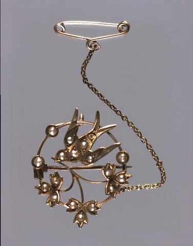 Circular brooch of 15 carat gold, set with half pearls. The motif is a bird (swallow carrying a branch with 3 leaves in its beak, backed by a circular frame. Set originally with 18 tiny half pearls (including 3 on each leaf); pearl on bird's tail is missing. A hinged pin at the back (metal unknown) secures brooch and a fine link chain (6cm long) with a small safety pin at end froms a safety clasp. Hallmarks stamped on underside of bird (see Accession Sheet for drawings). The brooch belonged to donor;s wife and/or other family members (She died 1983) Brooch was valued by Kozminsky Gallery Pty Ltd on 9.8.88 at $150.00. The valuer suggested that it may have been made by Wendt, circa 1910.It was also valued by Leonard Joel (Auctioneers and Valuers) on 5.7.88 at $150.00.