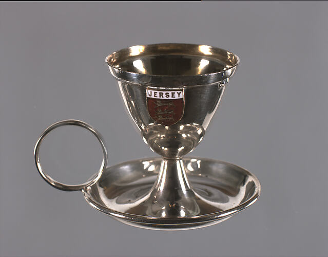 Silver egg cup, rounded conical cup mounted on smaller conical stem. The stem flares out to become a shallow concave dish. There is a ring mounted at one side of the dish. On the front of the cup, the ring is on the left, there is a shield of gold metal with red and white enamel. The borders are of gold metal, at the centre raised in gold metal there are three passant lions one above the other, they are surrounded with red enamel. At the top there is the word JERSEY in raised gold letters surrounded with white enamel. Stamped into the base there are the letters EPNS, below this there is a line of five symbols. Two raised areas of what appears to be silver solder, just below the rim to the right of the shield.