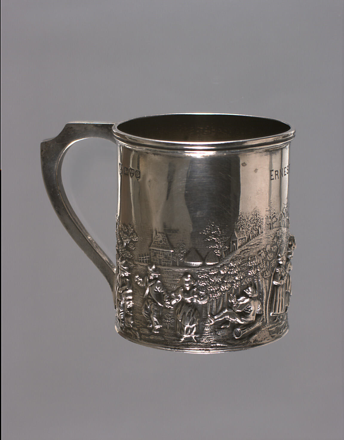 Silver embossed christening cup. The scene on the cup is child children on a common with the village in the background. The cup has straight sides and a thicker lip. The handle curves upwards and out from the base and then returns horizontally to the lip, the corner of the handle has been cut away in a concave curve so as to provide a space for the thumb. On the opposite side to the handle the owners name has been engraved. To the right of the handle there are four silver marks. The base is slightly inset and there is a number at the centre.