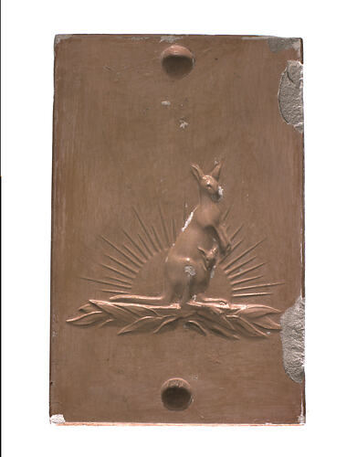 Plaster mould of upright kangaroo with rising sun behind and leaves at feet. Used to press (imprint) shape into leather goods at Simpson's Gloves Pty Ltd, Richmond.