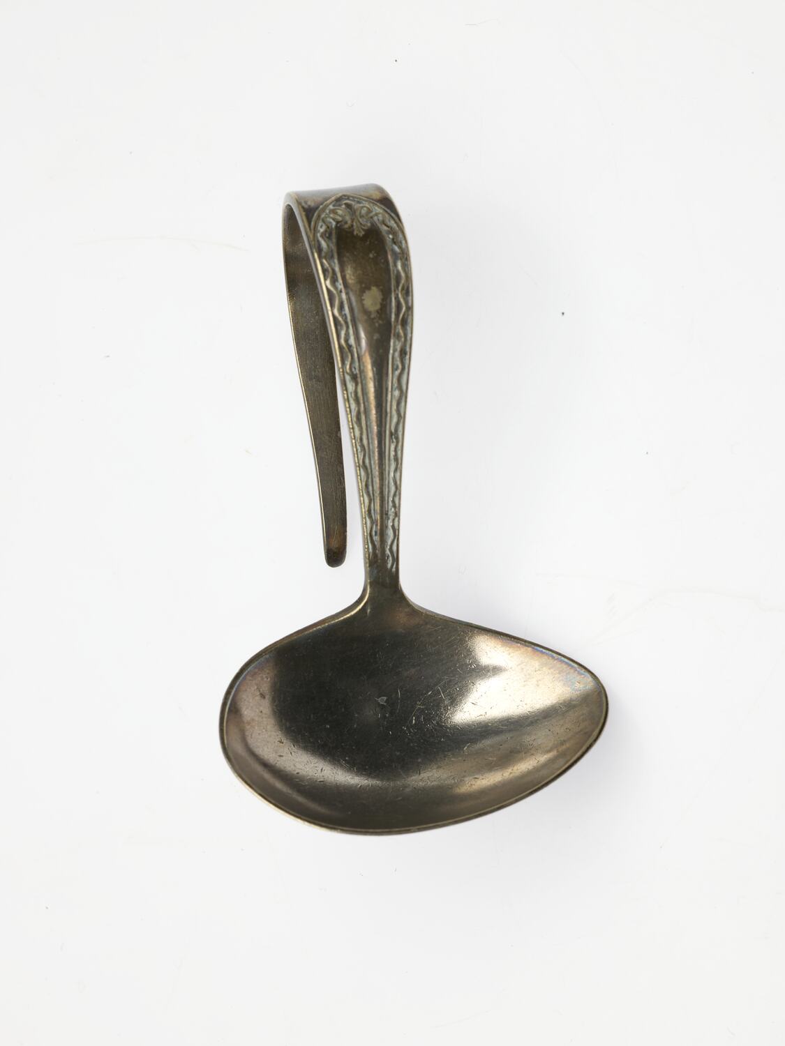 Silver-plated spoon. Spoon has a decorative handle which is bent into a U-shape. Bowl of the spoon is oval, tapered at one end and set laterally onto the handle.