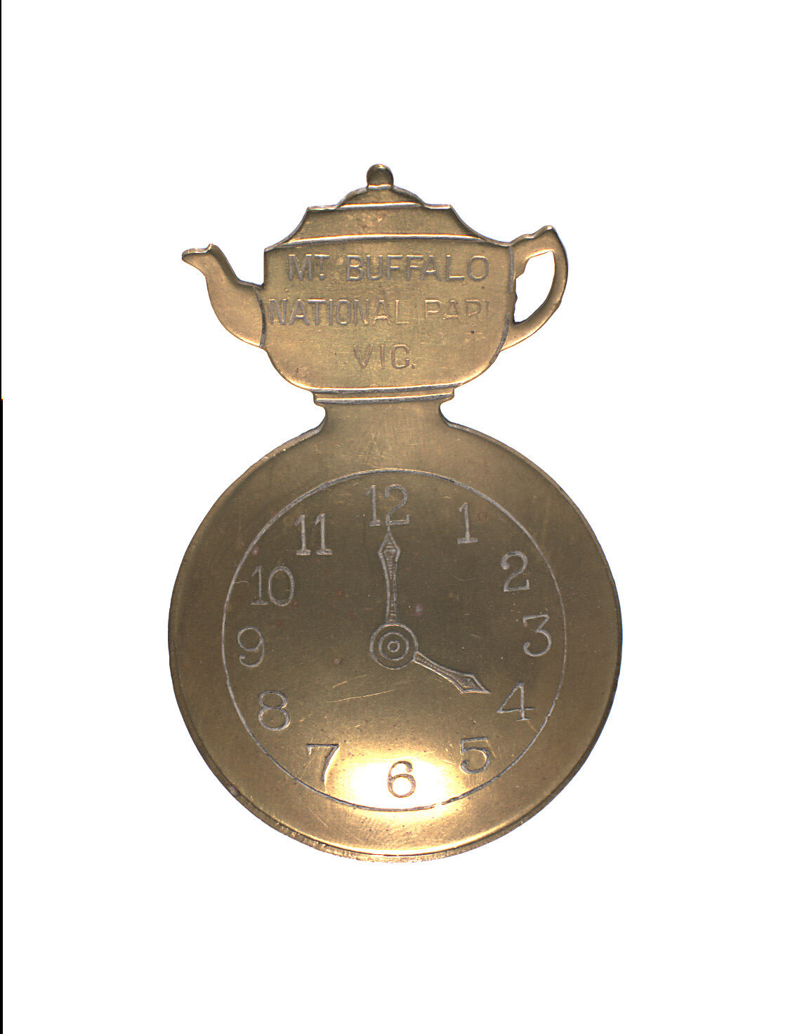 Stylised tea scoop, in the shape of a clock and a kettle, made of brass alloy and carefully debossed with wording and the time marked four o'clock on the clock - afternoon tea-time. It can be used to measure loose-leaf tea, before brewing in the tea-pot; however, it may have also been kept as a decorative item, and memento of a road trip.