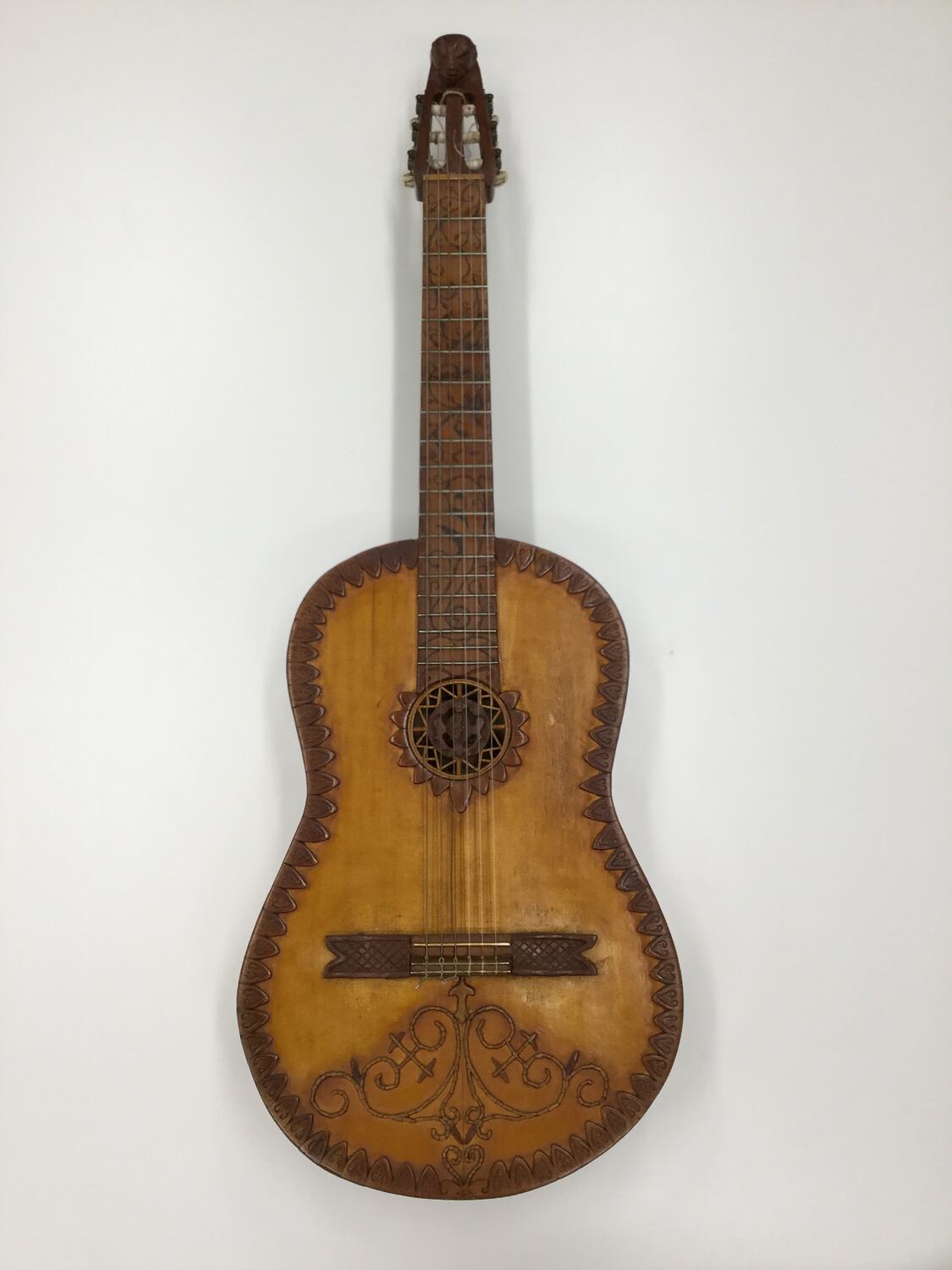 Guitar featuring intricate carving decoration around the front edge of the base, over the entire back of the base as well as decoration on the front and back of the neck of the guitar. The back has a shield-shaped design with a treble clef.